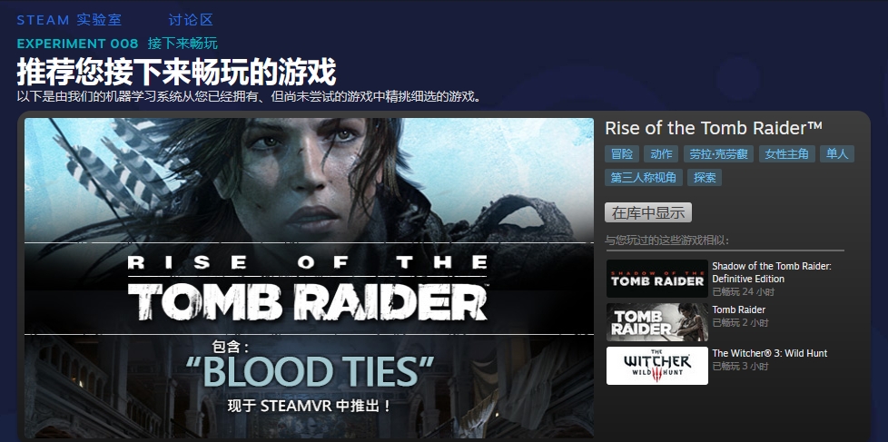 为了便于玩家了解系统推荐的游戏,官方还显示了推荐游戏的标签,同时还允许玩家点击“在库中显示”按钮,让玩家们更容易做出“接下来畅玩”的决定。