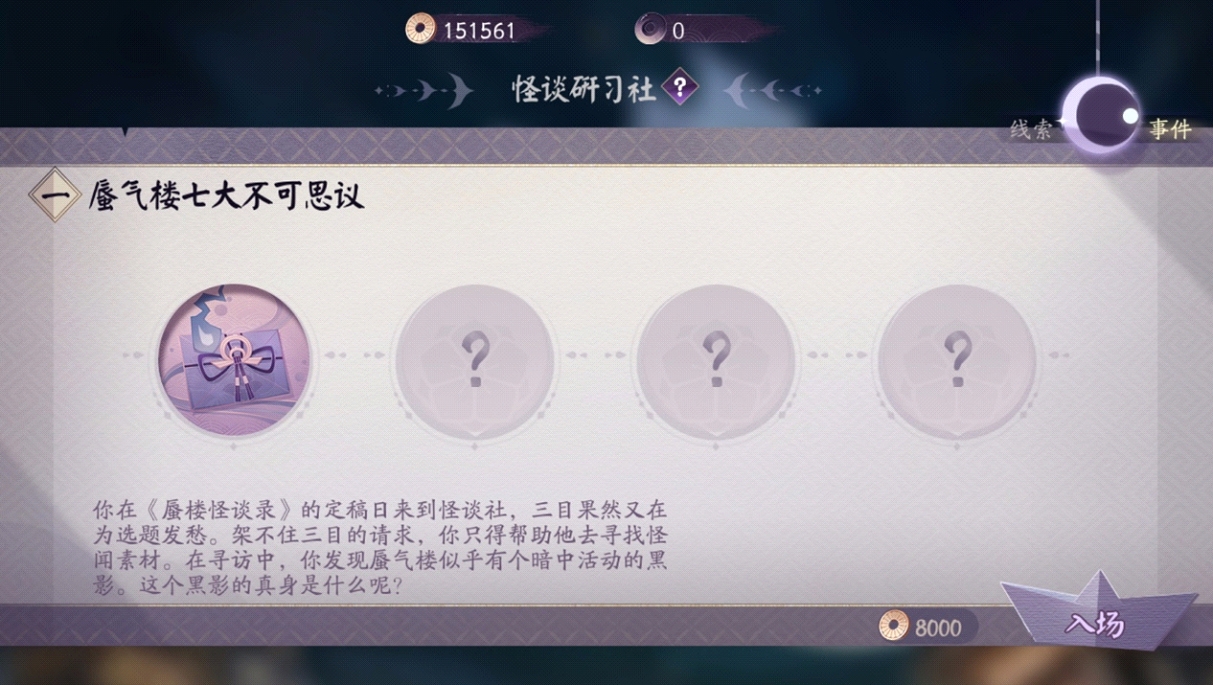 怪谈研习社的每册怪谈均为一个独立的剧情故事,由若干个章节组合而成。每次需要8000金币的入场费,也可以使用“怪闻墨玉”来开启。在进入怪谈冒险之后,将会遭遇不同的战斗或者事件,坚持得越久,就可以获得越高的奖励。