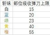 是不是说的有点绕。看下面这个图,当武器蓝斩,部位吸收20及以下,即使装备了心眼或者盾斧红剑。30刀蓝斩的斩味长度,实际只能砍20刀左右。