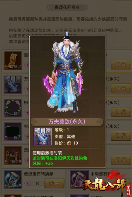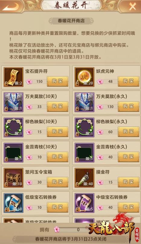 在《天龙八部荣耀版》迎春活动期间,玩家通过参与迎春系列活动、使用元宝购买等方式,获取专属道具“桃花”,前往春暖花开商店兑换宝石提升符、妖虎元神、万夫莫敌时装等专属好礼。