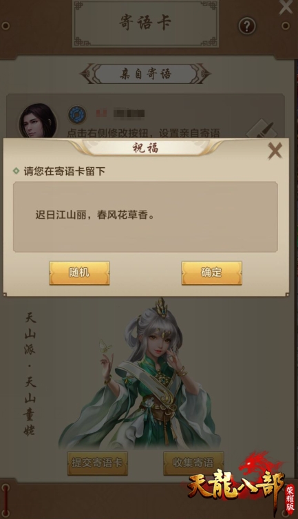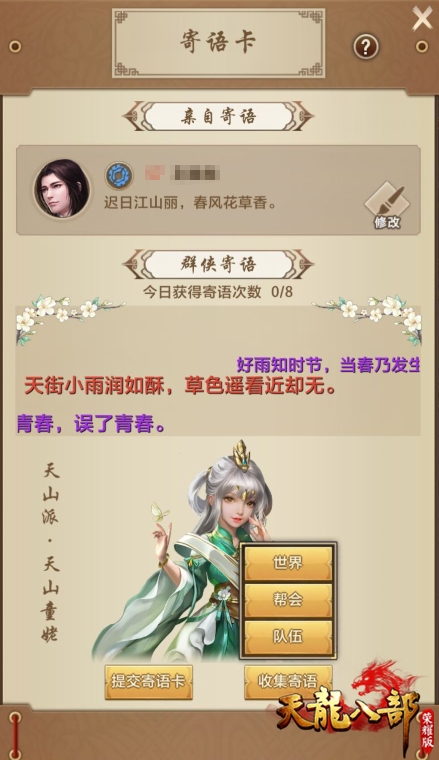 当然玩家也可以通过寄语卡向其他人发送春日寄语,帮助别人收集寄语完成任务,顺便秀出自己的文采才华,获得佳人的青眼相看。