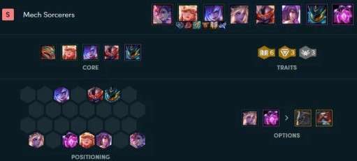 这套阵容是典型的法系输出阵容,新版的法师羁绊可提升法师英雄的技能伤害,使得这套阵容每个法师费卡都是主C点。阵容的重点就是,优先装备集齐,莫雷洛秘典 大帽子 大天使或者法爆拳套等等。其次就是阵容中后期3机甲使羁绊搭配4法师羁绊收益大于6法师羁绊,当然具体的选择根据战况而定。