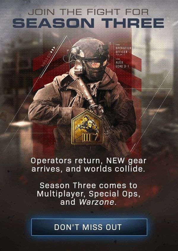 《使命召唤:现代战争》的第三赛季将于2020年4月8日正式上线。值此之际,动视官方向玩家们发送了推送邮件,揭示了第三赛季新角色“Alex”的外观形象 。