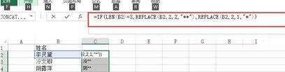 3、如果觉得名字两个字时,不想显示**,则可以对函数进行简单优化,对三字和两字进行简单的区分即可。=IF(LEN(B2)=3,REPLACE(B2,2,2,"**"),REPLACE(B2,2,1,"*"))