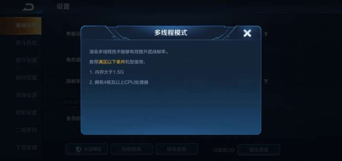 而多线程模式则打开,关于这项设置,系统一般都是默认为关闭的,所以很多玩家都没打开这项设置,如果这项设置没有打开,那么团战的时候会卡顿也是很正常的事,因为多线程模式的作用就是稳定团战时的帧率。关于这项功能,大家可以理解为打开了之后,手机的性能会完全发挥出来,从而稳定帧率,减少卡顿,提高你的游戏体验,不过这项功能调完之后需要重启游戏才能生效。