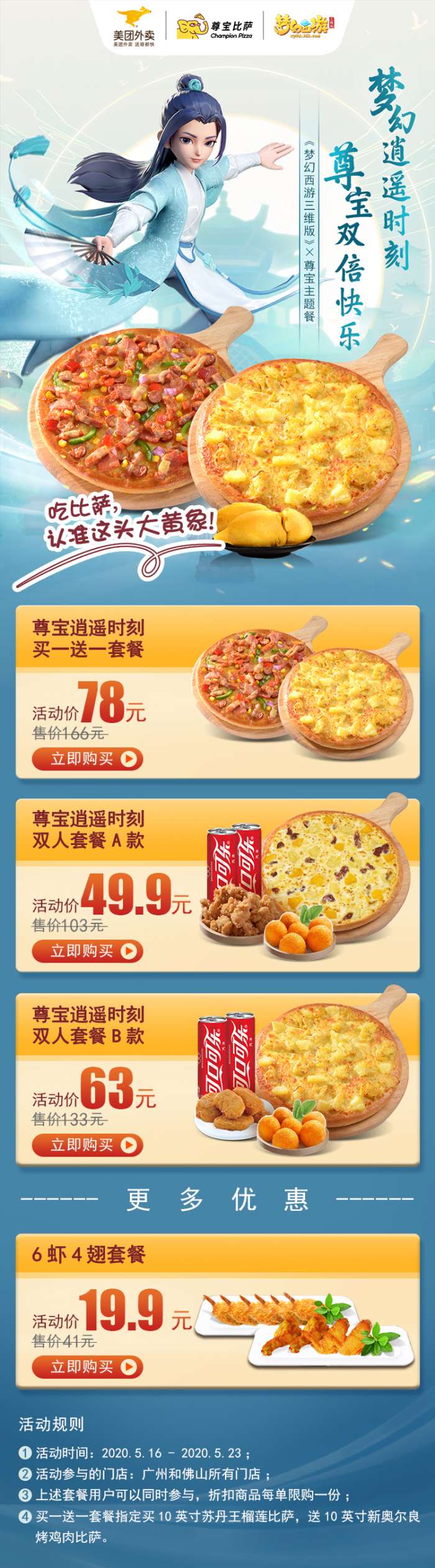 在5月16日-5月23日期间,通过美团外卖平台购买尊宝逍遥时刻套餐的朋友们都可获得相应的超值赠送,买1送1享受双份美味,让你在三界游玩之时亦能感受味蕾的快乐!