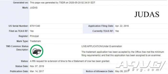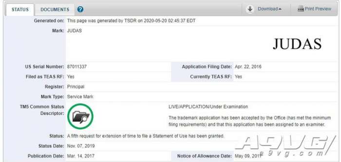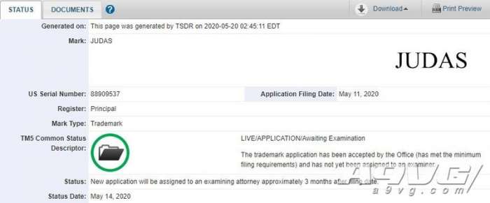 Rockstar与2K的母公司Take Two在2016年的时候曾在2016年4月注册过“犹大”这个商标,根据美国专利商标局的数据库可知Take Two在5月11日重新注册了这个商标。在2019年11月之前,Take Two曾多次申请过对此商标的延长,其内容包括电视游戏与电影等等。