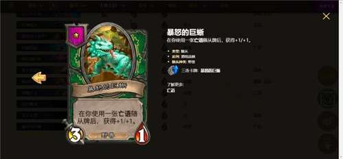 这种打法实际上很简单,不需要太多的操作,但是非常考验玩家的耐心,需要在123本时期选择按兵不动。在你能够三连的时候,选择的棋子也是亡语优先,其次就是要有利于场面的发挥。而食尸鬼和小黄人亡语圣盾的配合,就能达到削弱对手圣盾,buff己方圣盾的战术目的,最大化发挥己方巨蜥的战斗力。