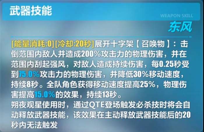 主动技能“东风”会释放一个风场,对范围内的敌人造成多段伤害,并降低其移速。且在提高接下来的一段时间内所有角色的移速和物伤。