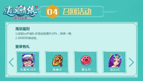 而且老玩家召回活动也已经正式开放了,只要你15天内未登陆游戏并且你的角色等级在60级以上,就可以享受组队经验+20%以及任务链经验翻倍的强力回归BUFF!而且还有连续一周的回归好礼在等着你哦!别再犹豫啦,只要你喜欢这里,逍遥的大门将永远为你敞开!