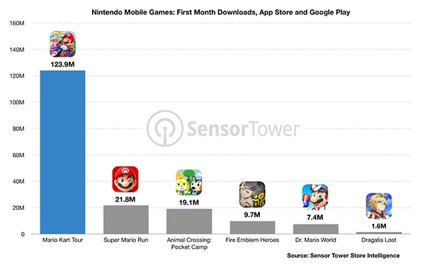 2019年9月底,《马力欧赛车Tour》手游正式登陆手机平台,目前在苹果App商店和Google Play商店下载量为1.239亿次,一举成为任天堂首发月下载量最高的游戏。