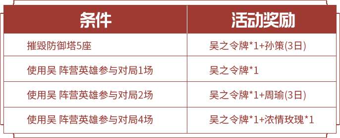 吴之令牌:打开后获得以下奖励之一,永久英雄(孙策、大乔、周瑜、小乔、孙尚香)、三日体验卡(孙策-海之征途、大乔-伊势巫女、周瑜-海军大将、小乔-万圣前夜、孙尚香-水果甜心)