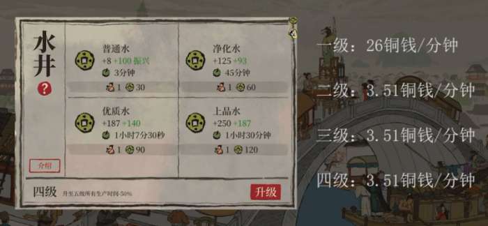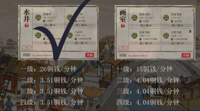 看到上面的收益之后很多玩家都觉得水井和画室根本不需要升级。实际上,虽然生产一级的收益要高于其他等级的收益,但是在升级到五级之后所有的生产时间会缩短一半,相当于提高了一倍的收益!从这点上来说,升级还是非常有必要的。