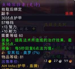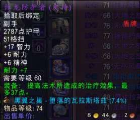 属性方面,红龙盾也是非常优秀的,高智力外加一点小精神加成,同时绿字收益提供了37点治疗效果加成,非常的均衡。这个盾牌只比产自TAQ奥罗BOSS的虫鳞阻挡者收益低那么一点点而已,大约是差一个5回4的收益吧。