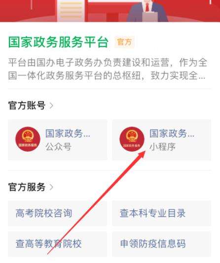 在出现的搜索结果中选择国家政务服务平台的小程序进行进入。