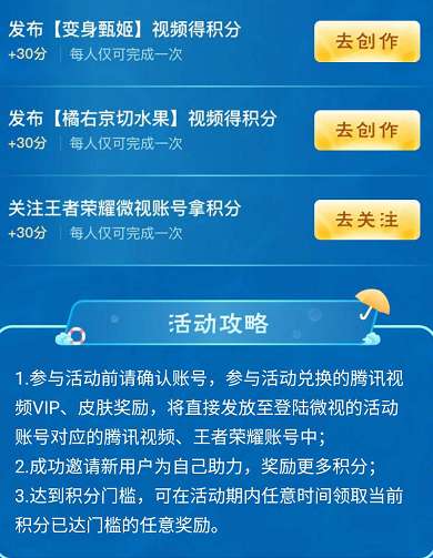 1.参与活动前请确认账号,参与活动兑换的腾讯视频VIP、皮肤奖励,将直接发放至登陆微视的活动账号对应的腾讯视频、王者荣耀账号中;