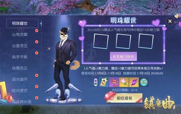 《镇魔曲》“盛世之欢”大型活动里,特推“单身魅力榜”,让天命者们在这个美丽又有点伤感的节日中,尽情展示个人魅力!每日里,天命者们都可以为心动男生、女生送上礼物,并收获“单身汪寻找券”等奖励。收到礼物的天命者则能提升魅力值,并以此排行,名列前茅即有丰厚奖励、限量称谓送上!