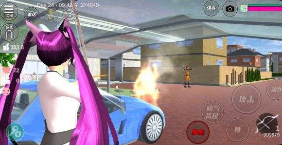 关于击败警车,一般是引进水里,或者用小男孩打,其实可以利用警车对撞。如图,用猫管家吸引仇恨,带到开阔地方,选择睡觉姿势躺好就行了,再换其他角色。过一会儿警车就炸了。