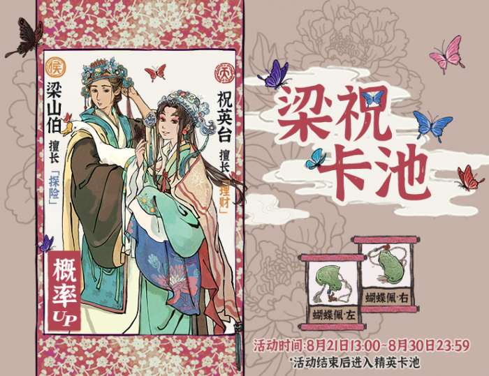 天级新角色【祝英台】&侯级新角色【梁山伯】、新珍宝【蝴蝶佩·左】&【蝴蝶佩·右】共同进入【梁祝】卡池。活动期间新角色将概率UP,且可以抽到新角色的专属珍宝,活动结束后新角色将进入【精英】卡池。