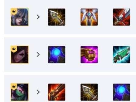 不祥之刃-卡特琳娜:蓝BUFF(泪滴+泪滴)、科技枪(大剑+大棒)、法爆(大棒+拳套)北地之怒-庄瑟妮:越肉越好