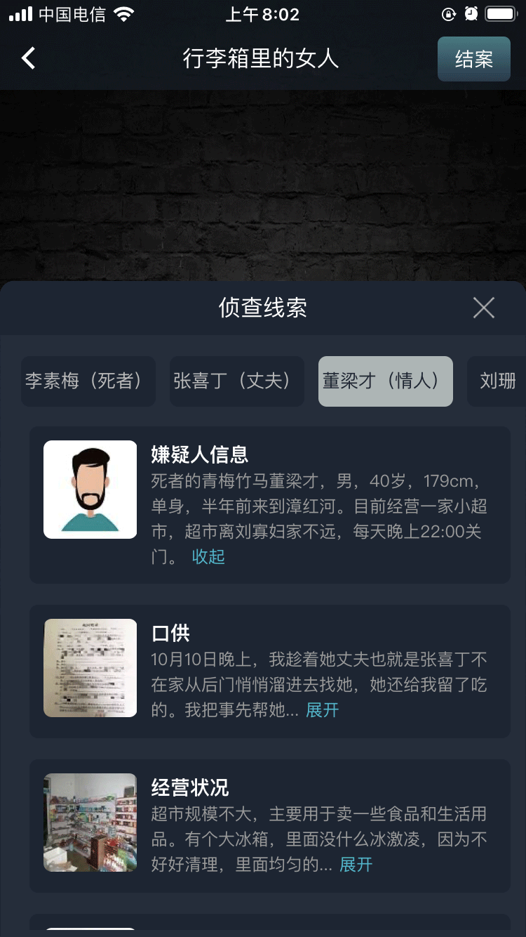 死者的青梅竹马董梁才,男,40岁,179cm,单身,半年前来到漳红河。目前经营一家小超市,超市离刘寡妇家不远,每天晚上22:00关门。