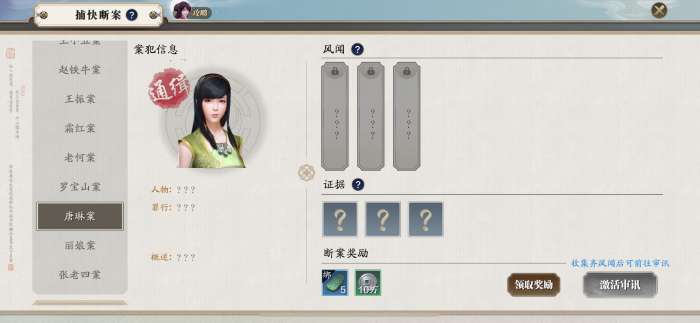 另一种游戏方式是破案,这种寻找线索破案的游戏方式考验少侠们的细心哦。玩家在逮捕过程中解锁风闻,这些风闻告诉玩家事件的线索,根据游戏内提供的事件和嫌疑人的信息,可以收集事件的真相。