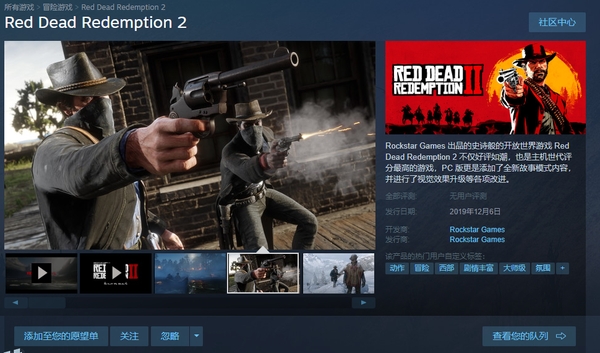 《荒野大镖客:救赎2》这个月初发售了,但由于种种原因未登陆Steam平台,而目前,R星官方更新了Steam商店页面,显示该作的Steam版将于2019年12月6日正式发售。