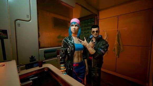 旅馆往左边酒吧导航,路线中间有一群人围着一辆卡车(也可能没有),左边有个死掉的NCPD,固定橙:全息染色警用护目镜