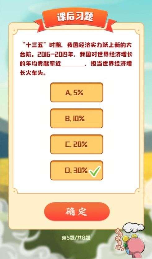 题目5:“十三五”时期,我国经济实力跃上新的大台阶。2016一2019年,我国对世界经济增长的年均贡献率近_____,担当世界经济增长火车头。
