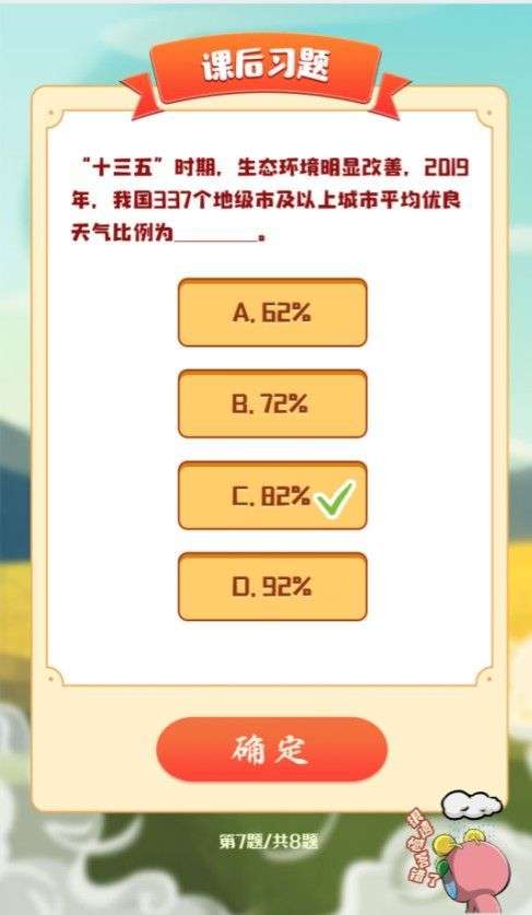 题目7:“十三五”时期,生态环境明显改善,2019年,我国337个地级市及以上城市平均优良天气比例为()。