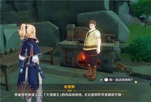 获取足够食材后返回去寻找哈里斯进行对话,这时哈里斯又提出还需要一份「大雪猪王的肉」。按照攻略进行的小伙伴们这时只需要掏出刚才击杀大雪猪王获得的「大雪猪王的肉」就好啦,没有的小伙伴可以按阶段一所示位置,去击杀一只大雪猪王再回来即可。