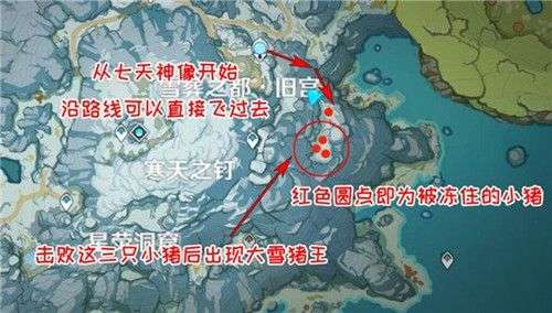 获得这种「冷鲜肉」需要我们先用火元素攻击,融化掉小猪身上的冰,之后再攻击小猪获得「冷鲜肉」,每一只被冻住的小猪可以掉落2份冷鲜肉,小猪的位置及到达路线如下图所示(动图中由于我已经完成了任务,小猪还没刷新,所以飞行时看不到,各位还没有做任务旅行者按照路线飞行的话可以很明显的看到下方被冻住的小猪)。