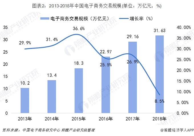 随着科技水平的提高,人们的消费方式逐渐发生了转变,2013-2018年,我国电子商务交易规模持续扩大,据中国电子商务研究中 心统计数据显示,2018年,我国电子商务交易额为31.63万亿元,较2017年增长8.5%。