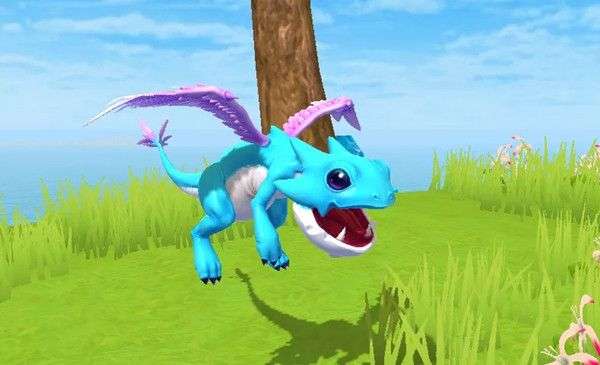 魔法灵龙通体亮蓝色,有双blingbling的大眼睛,瞳孔、双翅、尾尖的淡紫色让它看起来神秘又梦幻
