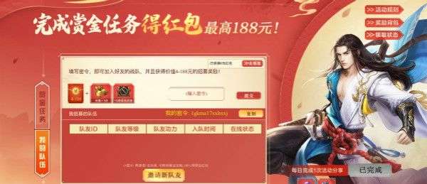 完成赏金任务,必得现金红包!参与【领红包】活动,邀请好友加入队伍,最高可领取188元现金红包!更有专属永久时装·穹宫神铭,元宝奉上!