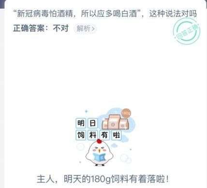 蚂蚁庄园新冠病毒怕酒精所以应多喝白酒这种说法对吗,这个觉得这说法是否有科学依据呢,很多人都不清楚其中的原理,新冠病毒怕白酒吗,多喝白酒对吗。下面就来介绍下多喝白酒防新冠对吗。