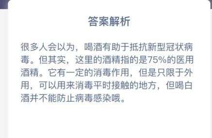 答案解析:很多人会以为,喝酒有助于抵抗新型冠状病毒。但其实,这里的酒精指的是75%的医用酒精。它有一定的消毒作用,但是只限于外用,可以用来消毒平时接触的地方,所以喝白酒并不能防止病毒感染。
