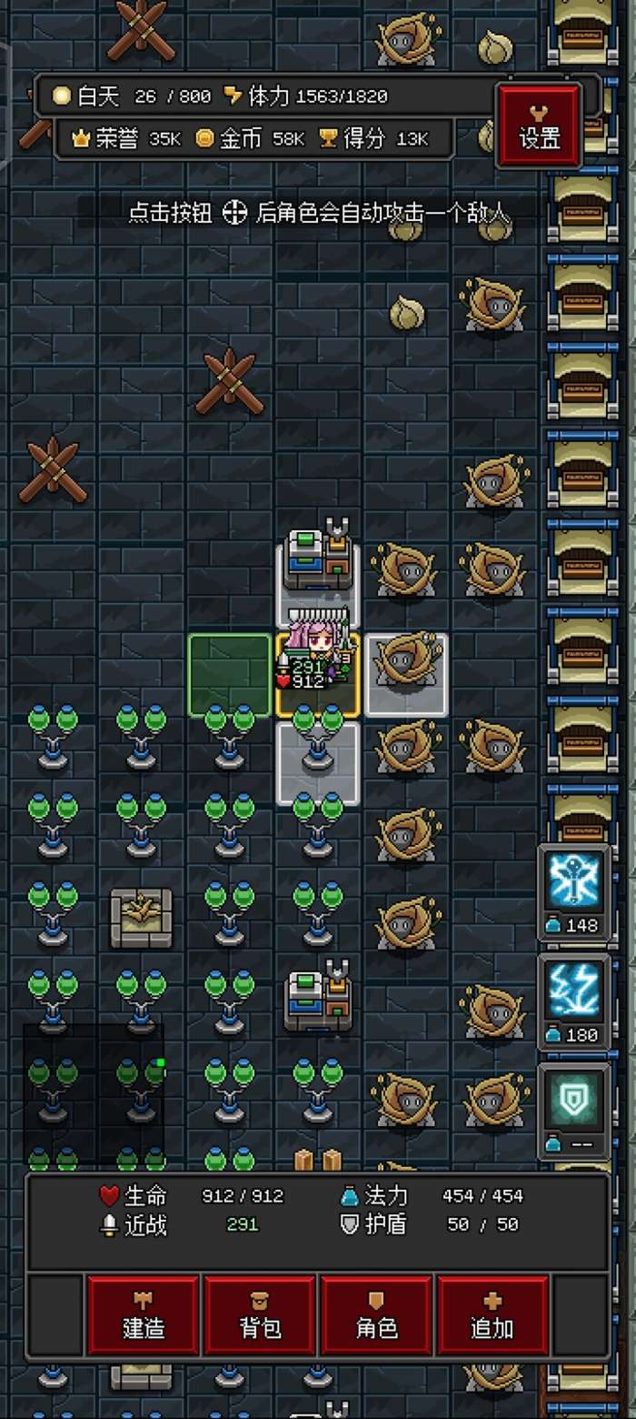 前面挖的矿可以做一点防御晚上刷怪荣誉会很多,可以直接升级血量什么的(这里面技能是王道)基础攻击力有点乐色