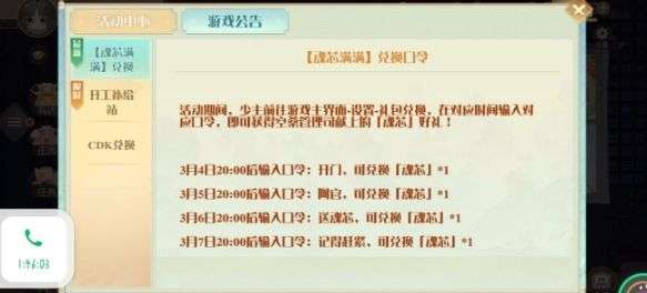 活动说明:活动期间,前往游戏主界面-设置-礼包兑换,在对应时间输入对应口令,即可获得空桑管理司献上的「魂芯」好礼!