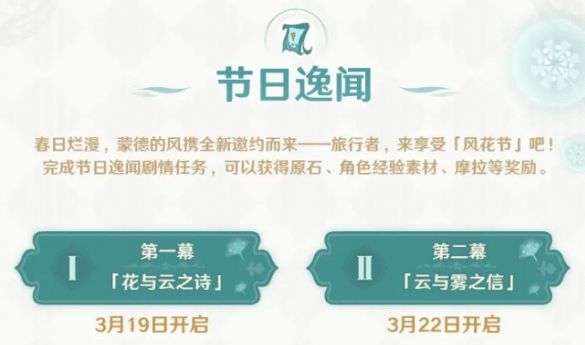 活动期间,将开启风花节系列任务。节日逸闻共分为四幕,将会随时间开放新的任务,完成任务可获得原石、角色经验素材、摩拉等奖励。