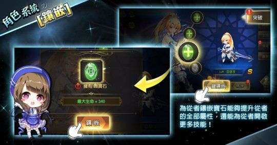 3、镶嵌:御主可以通过冒险以及游戏内商店或者其他系统获得符石,角色通过镶嵌符石即可提升战力,镶嵌满后即可进行角色突破,提升从者品阶,从者品质的提升将会解锁从者新的技能栏。