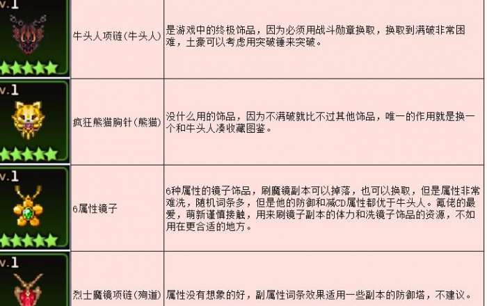 以上5件装备都是红色装备,平时会较容易获取,千万不要觉得他们没用而合成或者贩卖。游戏目前已经开放了词条洗练功能,后期还会开放锁定词条功能,因此这些装备都是可以洗到最大属性的极品,为什么我不推荐金色或者绿色装备呢,因为金色或绿色装备获取困难,更难满破,用突破锤来突破武器比饰品更划算。