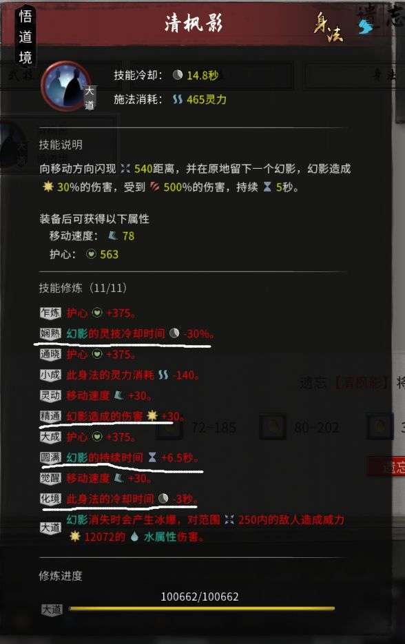 所需词条:自身幻影消失回复灵力(这个是最重要的一个词条,因为水系身法很费灵力)其次有条件的话加一个灵力低于20%自动回灵,使用身法时回灵,反正回灵词条越多越好。