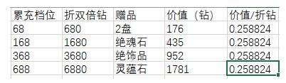 至于泫露,3000个泫露能换1个绝饰品,平常分解绝饰品是600露,所以奖励中的360个能折0.6个绝饰品,考虑368档累充赠送的是绝饰品,假设各档赠品价值/折钻比例一致,则可以暂且将绝饰品定价在435钻,因此泫露价值=952*0.6=571钻。