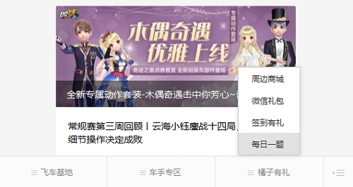 第一步、车友点击《QQ飞车》公众号菜单栏【橘子有礼】-【每日一题】,触发答题玩法,每天都有1次答题抽奖的机会~(即使答错了也没关系,官方会给小提示的);
