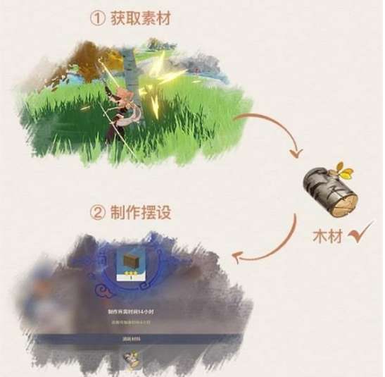 旅行者们获得并学习摆设图纸后,与壶灵交互可以进行摆设的制作。旅行者们可以通过砍伐树木、采集矿物或植物,在壶灵处制作布匹或染料,以获取家具制作素材。