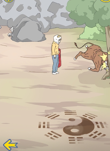 2.然后进入右边的界面,对牛使用红色的围巾,对着法阵使用空碗,点击地上的树枝并获得;