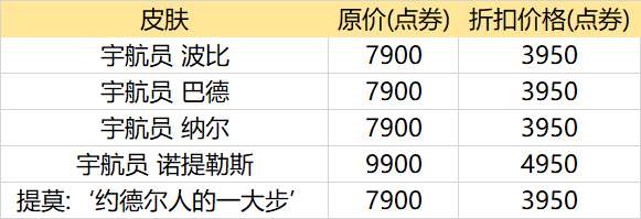 9款宇航员主题皮肤:宇航员 库奇、宇航员 茂凯、宇航员 维迦、宇航员 拉莫斯(以上四款宇航员皮肤将于2021年6月25日12:00上线)、宇航员 波比、宇航员 巴德、宇航员 纳尔、宇航员 诺提勒斯、提莫:‘约德尔人的一大步’