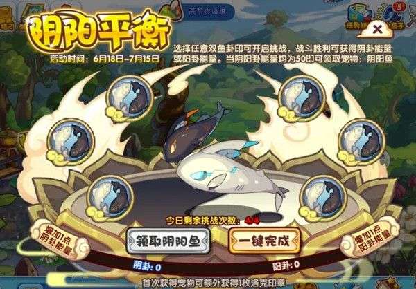 选择任意双鱼卦印可开启挑战,战斗胜利可获得阴卦能量或阳卦能量。当阴阳卦能量均为50即可领取宠物:阴阳鱼。
