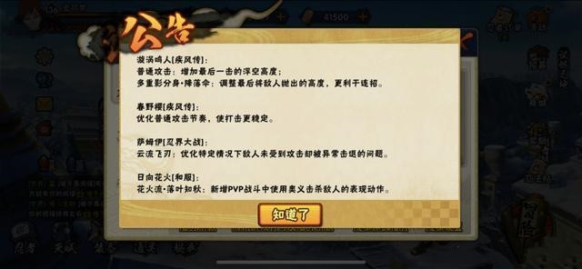 忍者平衡性调整,第一个看到的是初代,但这次调整同样不是在忍者本身,还是在专属秘卷上面,之前曾经削弱了树界降临(一字连柱),加强了明神门(扦插)的效果,现在是统一调整成了30秒的CD时间,初代现在使用扦插和一字连柱都是20秒CD,所以是直接增加了10秒CD,这个调整略微有点影响。